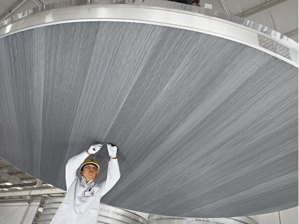 在相當(dāng)長的一段時間內(nèi),由于技術(shù)水平和生產(chǎn)設(shè)備的限制,如何提供更大盤徑的整盤型空分填料成為了全世界填料生產(chǎn)企業(yè)的重要難題。經(jīng)過不懈的努力和創(chuàng)新,天大北洋化工克服了技術(shù)壁壘,在2005年自行設(shè)計并開發(fā)出了用于生產(chǎn)整盤填料的自動生產(chǎn)線。從此,在提供傳統(tǒng)的分塊填料之外,天大北洋化工也可以批量生產(chǎn)更大盤徑的空分填料,目前我們可以供應(yīng)盤徑最大為5.5米的整盤空分填料。